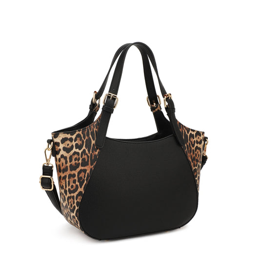 ELAINE SATCHEL WITH LEOPARD PRINT ACCENT IN BUCKLED HANDLE