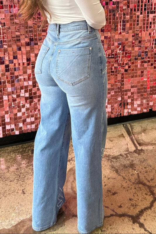 Light Blue Floral Rhinestone Decor High-Rise Wide-Leg Denim Jeans