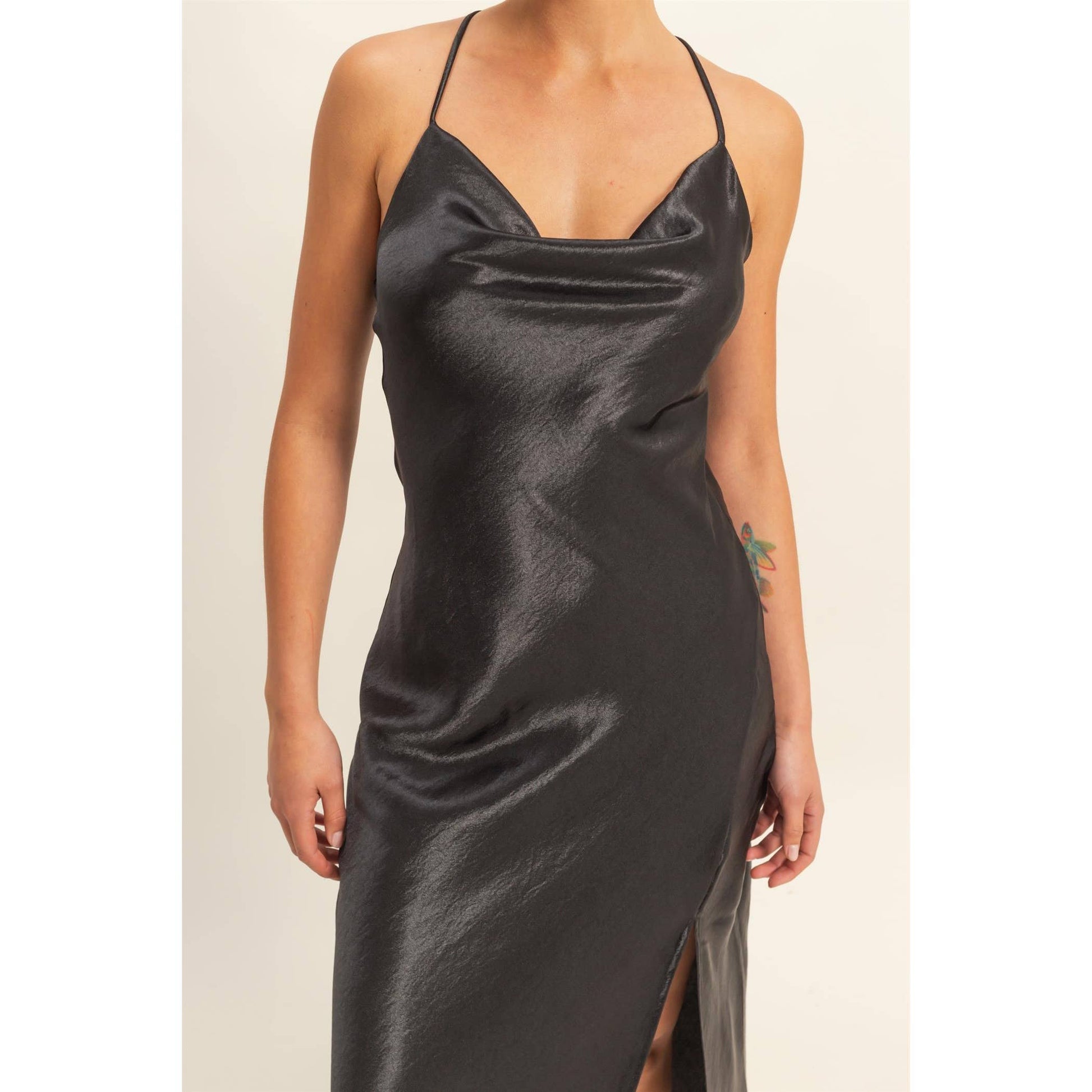 This Versatile Satin Dress Is The Epitome Of Perfection And Features A Cowl Neck, Supported By Thin Shoulder Straps That Crisscross At Back. A Fitted Bodice Continues Down Into A Flowy Skirt, Completed With A Skin Baring Low Back.