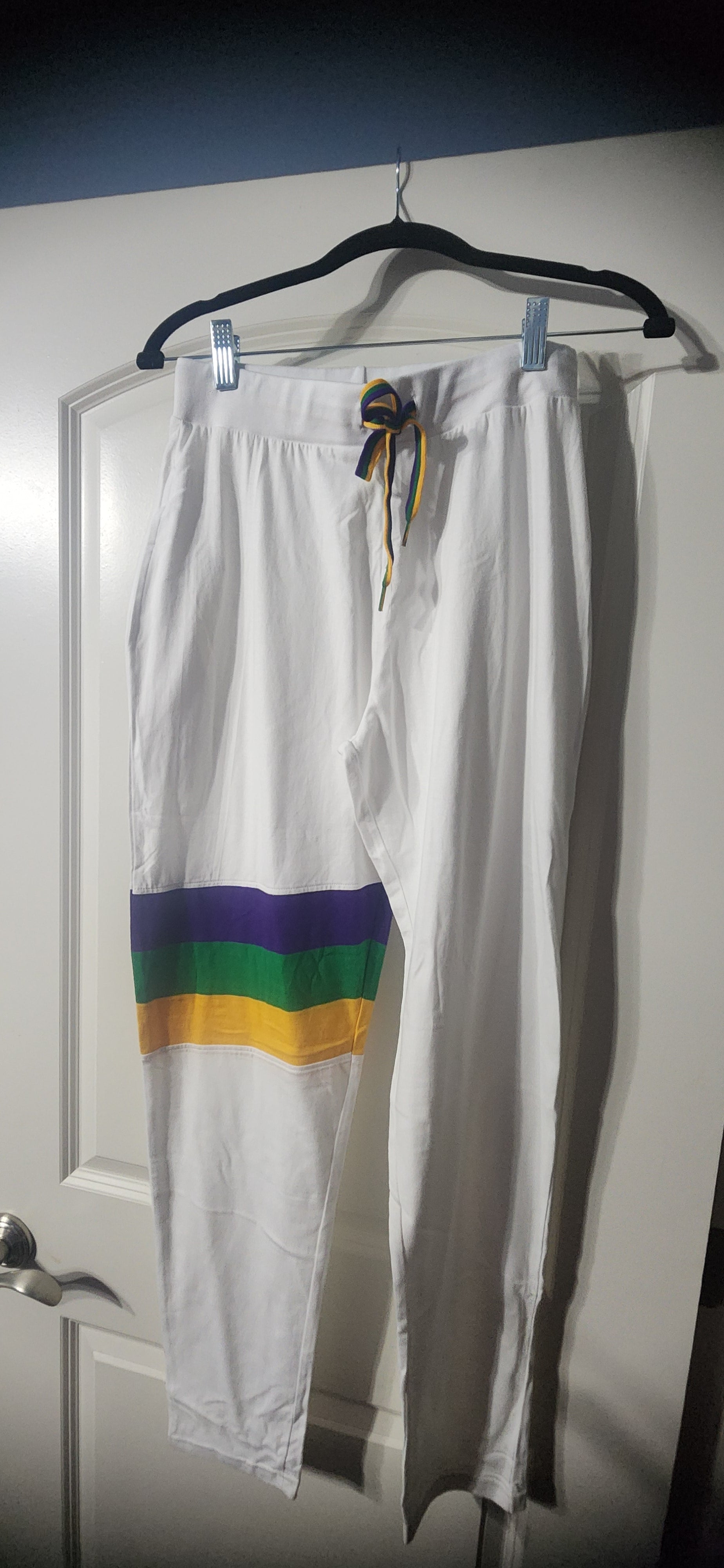 Expertly designed by Mardi Gras Creations, these White Mardi Gras Pants feature a flattering tie waist and a unique purple, gold, and green stripe at the knee. Perfect for any festive occasion, these pants make a statement with their stylish design and comfortable fit.