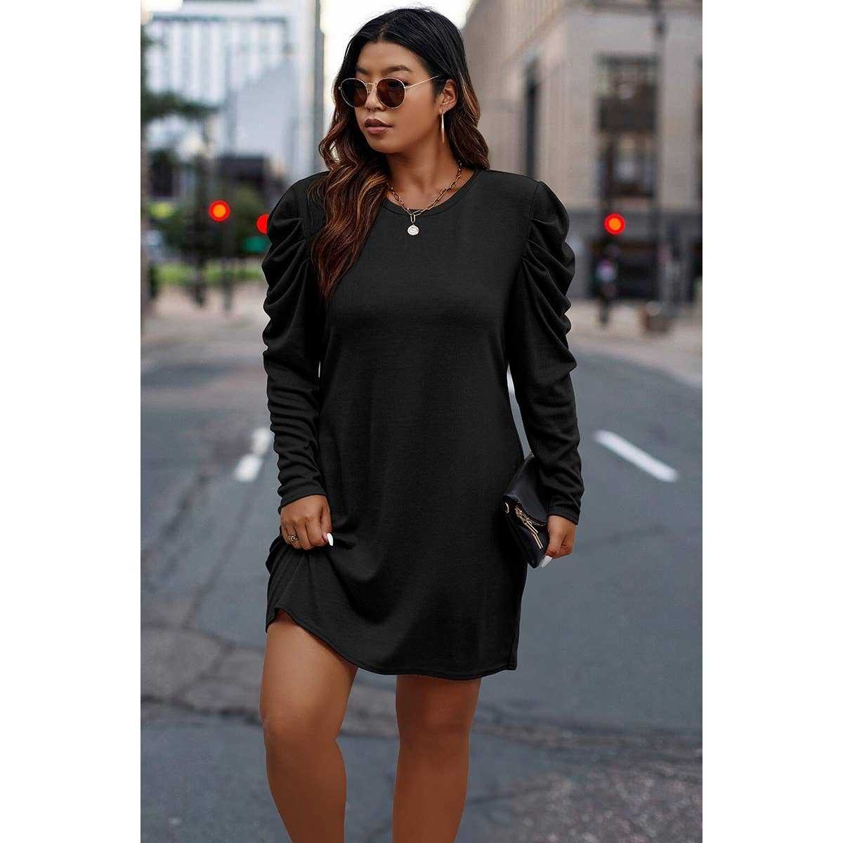 Features: Plus Size Solid Round Neck Ruched Fit Dress