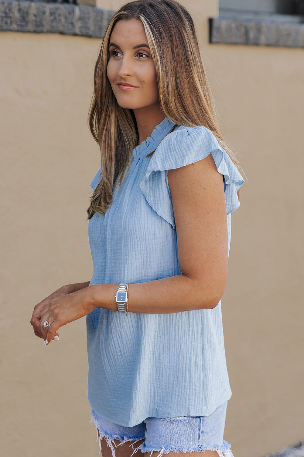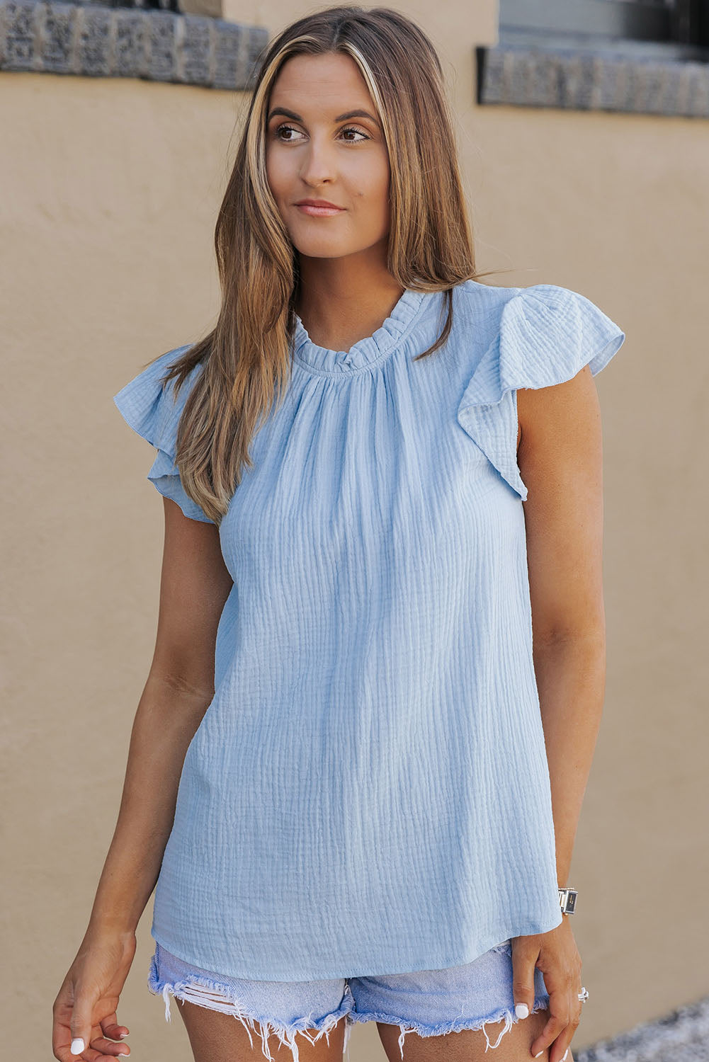 Sky Blue Flutter Sleeve Frilled Neck Textured Blouse